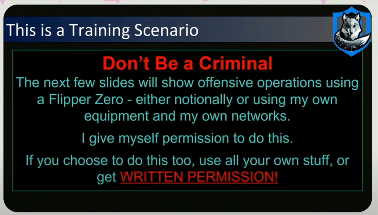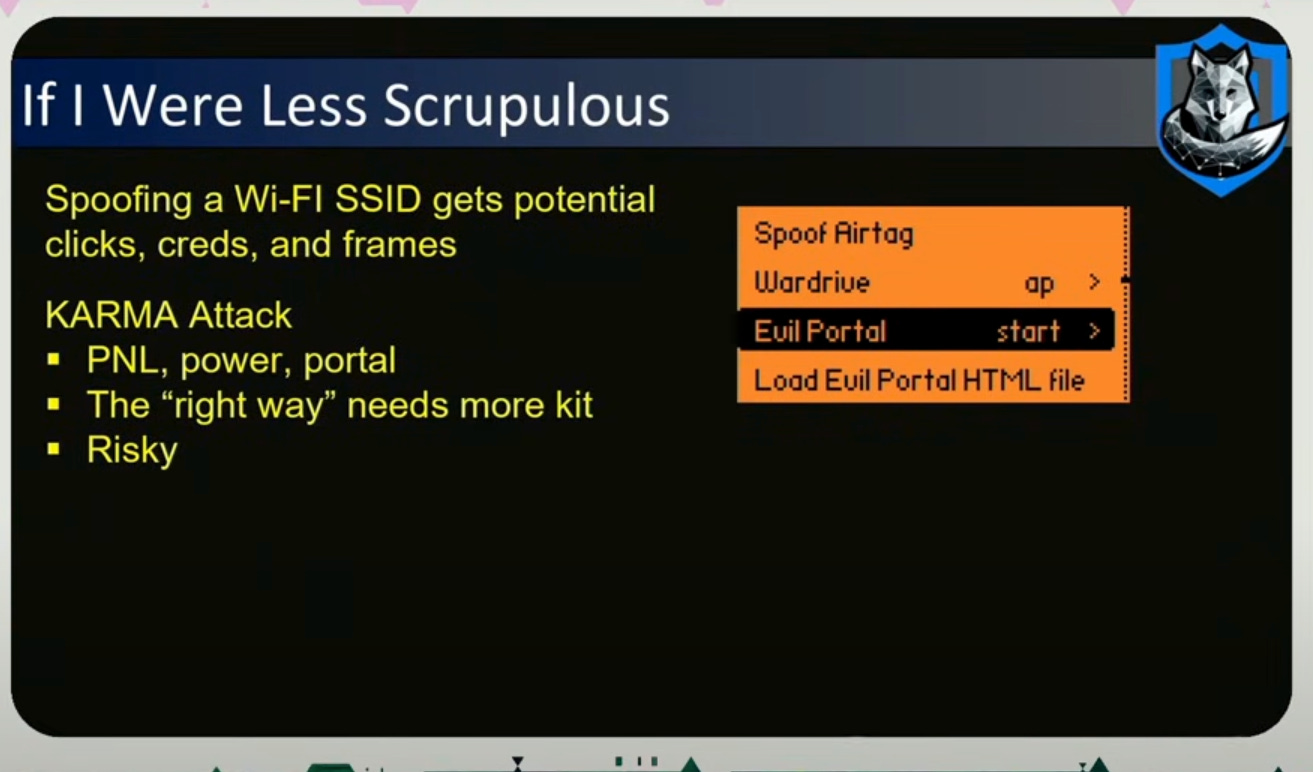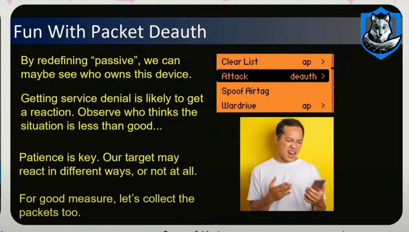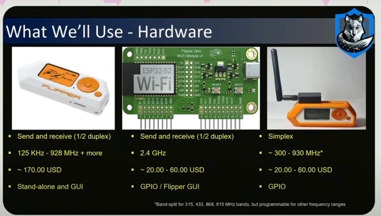 The goal for the talk was to speedrun survelliance on a high value individual (HVI), which just a Flipper zero, an ESP32 submodule to half-duplex (transmit and receive on different frequencies), and an external sub gigahertz antenna (useful for picking up radio signals, IoT signals, Car Fobs, TPMS (Tire Pressure Monitoring System), everything that operates below 1 GHz)