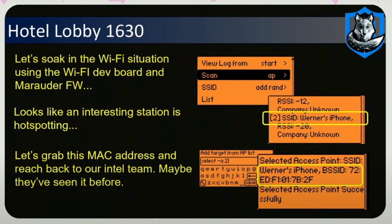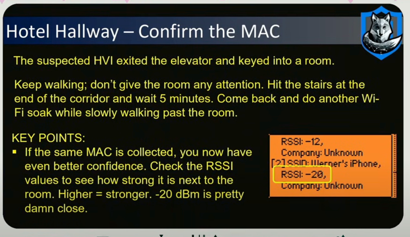 If the suspected HVI goes into a hotel room and you hypothesize you have the MAC address, then as you tail them into their hotel lobby, you can check the RSSI values to see how close their wifi signal is. Higher = stronger. -20 RSSI is pretty good signal that you uniquely identified their device with a MAC address.