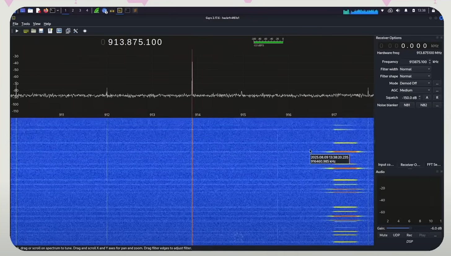 Running the software titled GQRX, which is a software defined radio, we explored, viewed, and recorded radio waves. We see lots of activity around 970 MHz which is the default meshtastic configuration that most people are running at DEFCON.