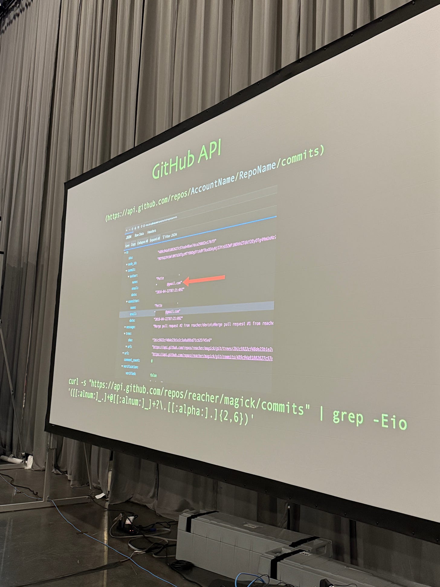 curl "https://api.github.com/repos/{AccountName}/{RepoName}/commits"and replacing {AccountName} and {RepoName}, we can use regex to extract out specifically the email address from the commit log. Here’s one to extract the user {reacher}’s email from their repo, {magick}. Run it in warp to see it for yourself