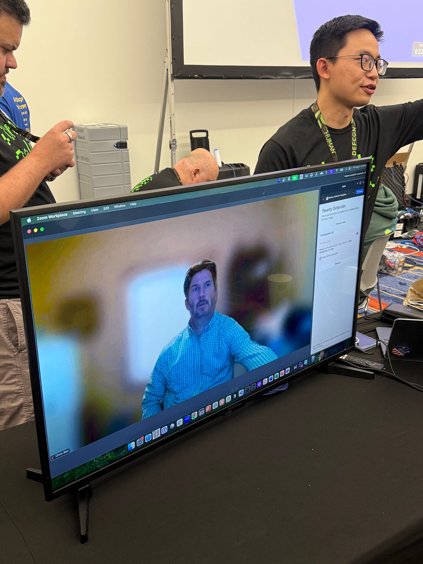 I had a chance to check out two setups at the AI village, the deep fake bot made by zeetwii and Reality Defender where adversaries setup Google Meet’s, Zoom’s and other video conferencing software with deepfakes like Leonardo Di Caprio or Keanu Reaves. After joining these calls with Reality Defender, they alert you when a deep fake has been spotted.