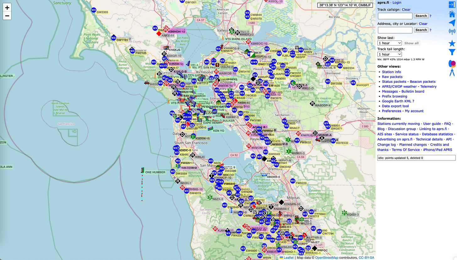 aprs.fi, APRS (Automatic Packet Reporting System) shows live and historical positions, telemetry and messages from APRS stations (ham radio operators, weather stations, balloons, boat, by aggregating packets from the APRS-IS internet backbone and from local receivers