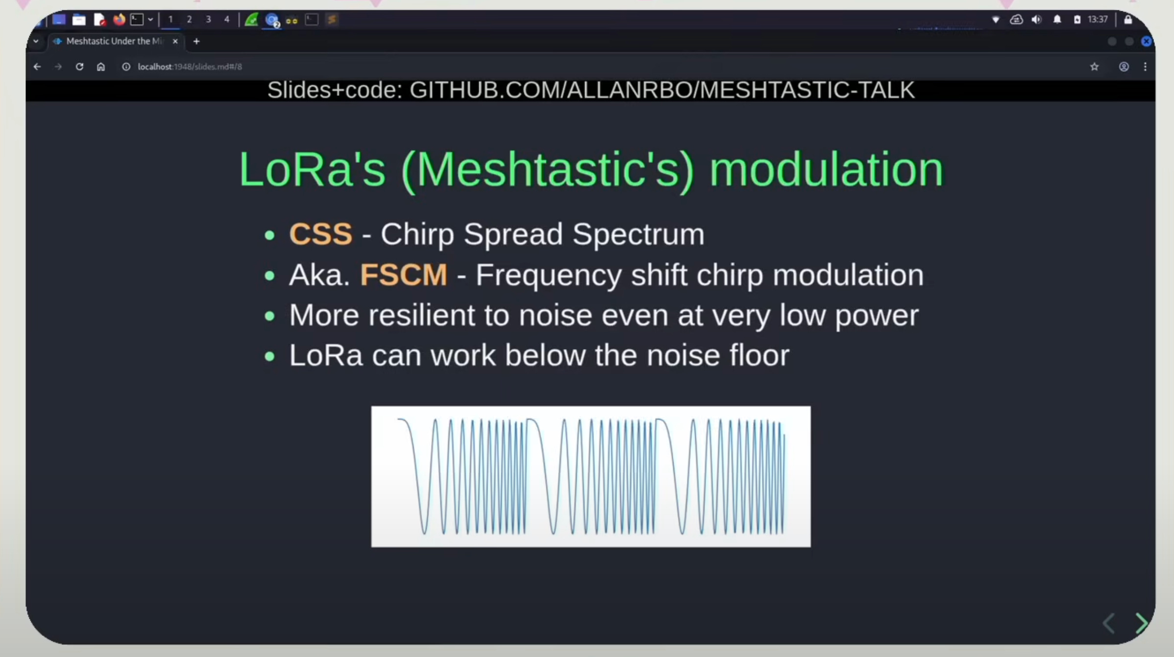 Meshtastic’s signal frequency is CSS (Chirp Spread Spectrum) which is a very specific type of modulation that is very resilient to noise, which makes it work at very low power.