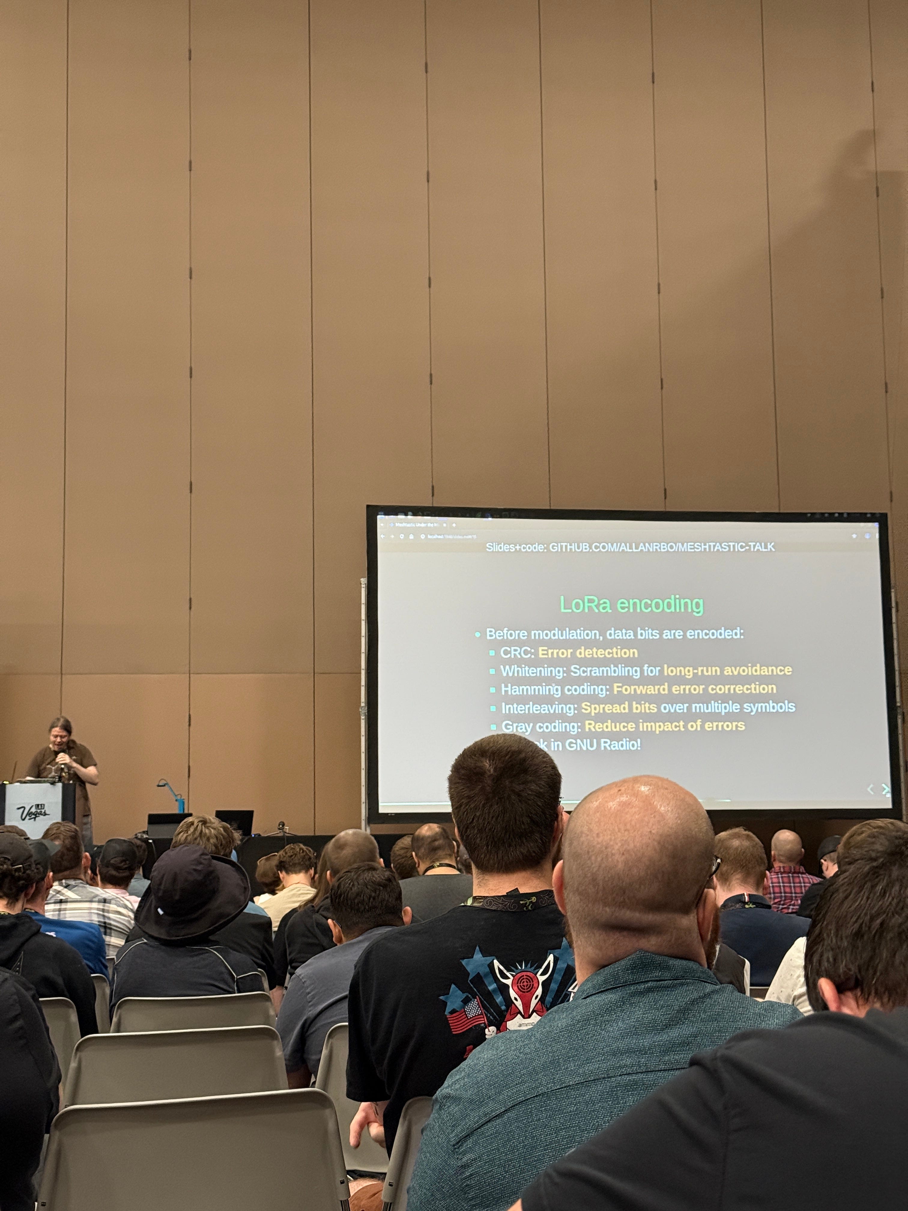After using wireshark to decode meshtastic packets, figuring out which bytes of the packet correspond to destination, sender, packet ID, flags, channel hashes and the payload, Allan showed how to write a script to then send packets over the meshtastic protocol so that audience members were able to receive communication! Full script here.
