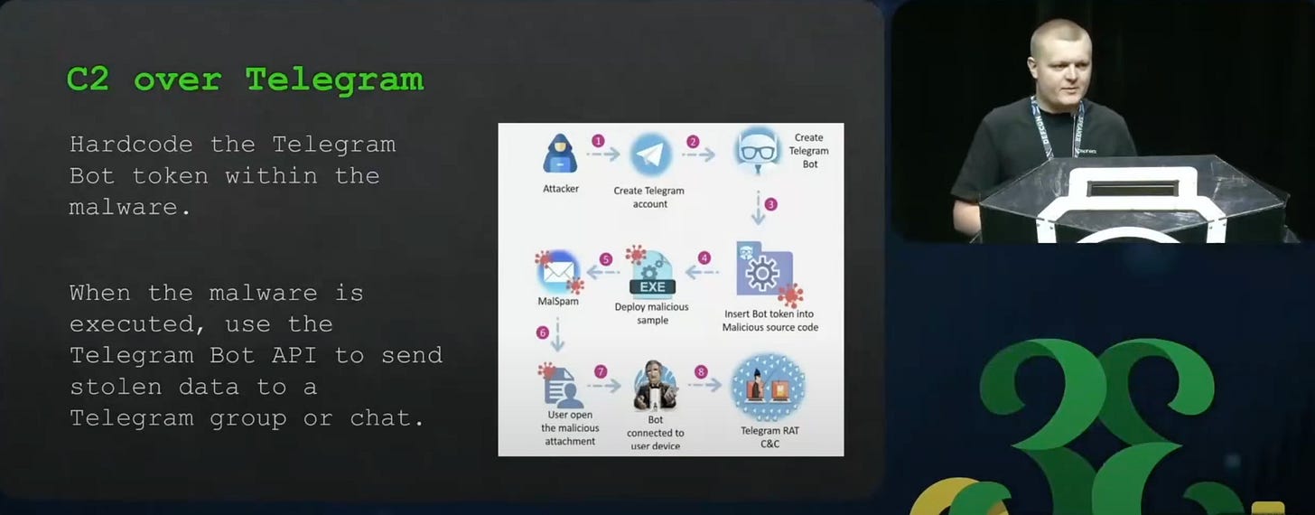 As a command and control platform, Telegram is one of the best since it has high-availability, cheap, and “serverless”. By creating an account, getting an API key and setting up a Telegram Bot, you have a quick and easy way to have command and control. Even RATs (remote access trojans) developed by nation states, use telegram as a way to communicate.