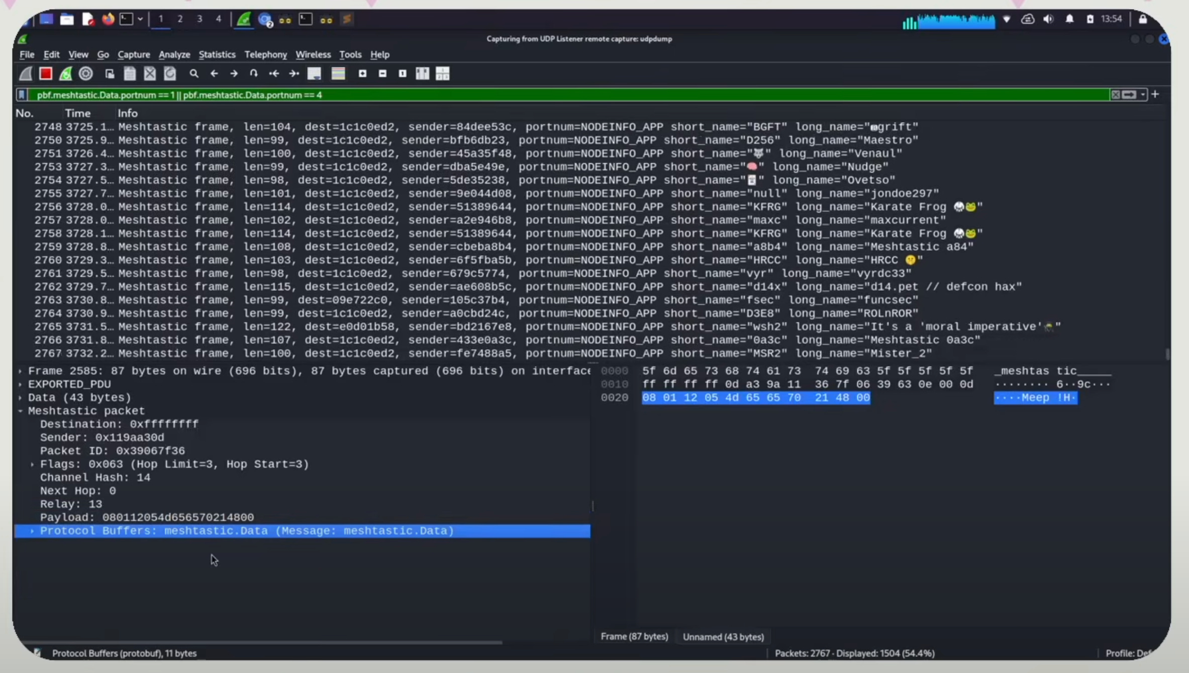 Overall, a great deconstruction of the entirety of meshtastic - from understanding the specific wavelengths for meshtastic, packet decryption using wireshark, and then reconstructing the packet to then send to other meshtastic nodes on the DEFCON ecosystem.