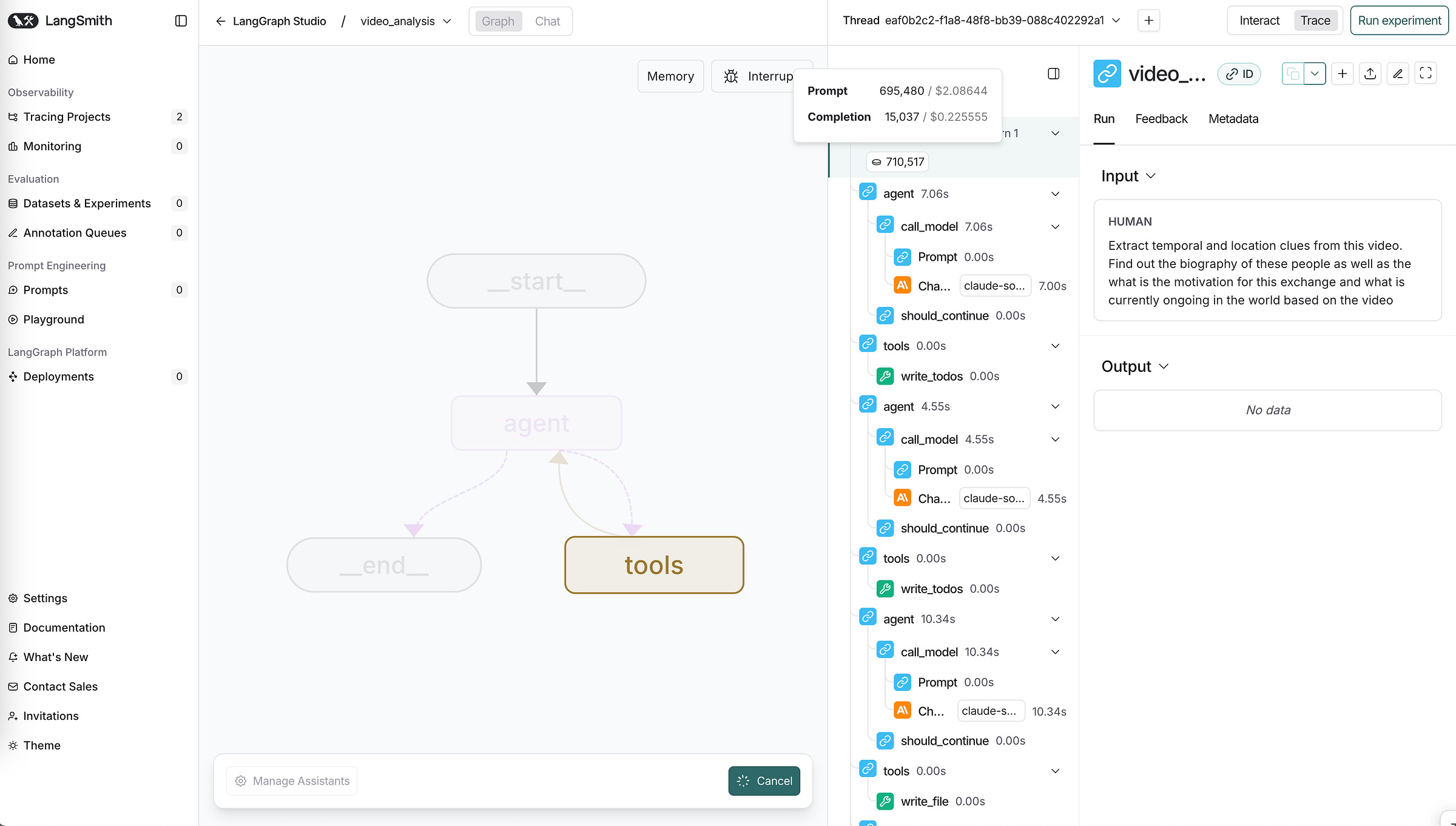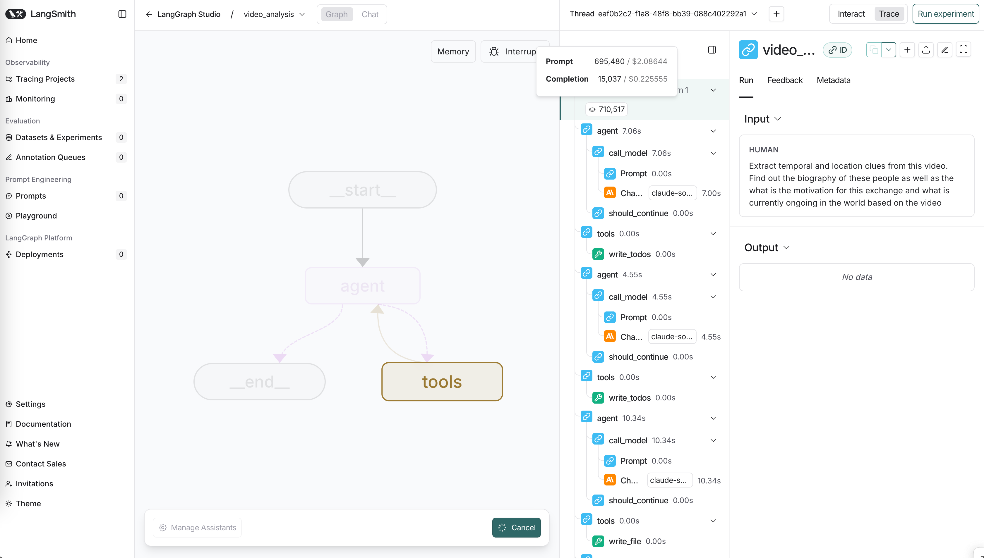 I ran the AVH agent myself locally and I was impressed with the level of detail and extraction from detecting the faces, to building out transcriptions from the video, however, it seemed like the number of tokens needed for processing a video was quite high. A 3 min video required a 695,000 tokens, which was still ongoing in Langsmith.